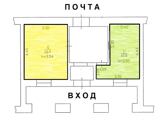 Помещение 2 - на плане выделено жёлтым цветом. Общая площадь 15,4 м2, аренда в месяц 15 тр.